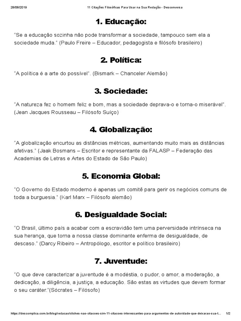 As citações para redação são pequenas frases ou trechos de obras de grandes autores ou especialistas em … Oct 29, 2020 · por esse motivo, selecionamos 20 citações de filósofos da filosofia antiga, medieval, moderna e contemporânea para usar na redação do enem. É a mais inteligente, a mais culta, a mais criativa, a mais inovadora.. Confira algumas citações para redação por tema que é bastante atual e pode sim cair em sua redação e nem: